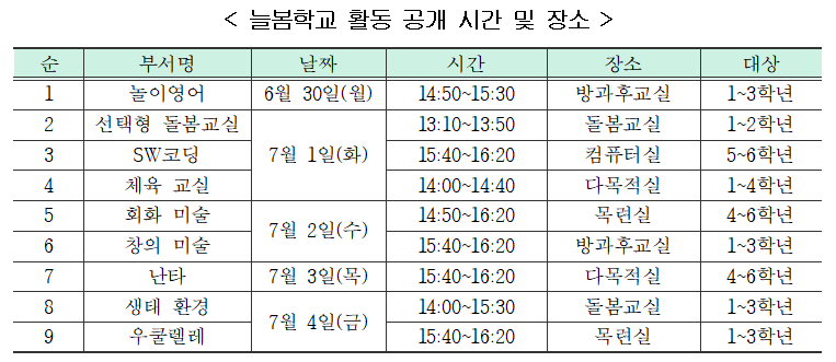 2. 주요 내용 가. 대상: 늘봄학교, 학교특색사업, 초등돌봄교실 참여 학생 나. 내용: 부서별 프로그램 활동 공개 및 학부모 의견 수렴 다. 일정