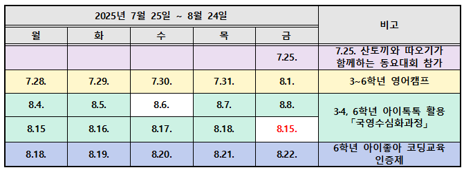 <여름방학 일정> *방학식: 2025년 7월 24일(목) *방학 기간: 2025년 7월 25일(금) ~ 2025년 8월 24일(일) / 총 31일간 *개학일: 2025년 8월 25일(월), 정상 수업 및 급식 실시 * 여름방학 프로그램  * 여름방학 중 돌봄교실: 전교생, 평일 전일 운영